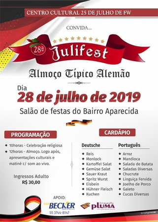 No fim de semana Frederico Westphalen vive a 28ª edição da Julifest. O evento promovido pelo Centro Cultural 25 de Julho acontece no domingo, 28 de julho, no Salão do Bairro Aparecida.