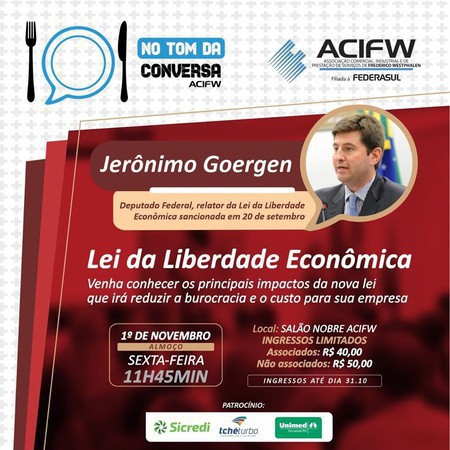 O relator da Lei da Liberdade Econômica, deputado federal Jerônimo Goergen, participa nesta sexta, 1º, do evento No Tom da Conversa, promovido pela ACI-FW, a partir 11h45. Sancionada em setembro, as regras tratam do fim da autorização prévia para atividades econômicas de baixo risco, a liberdade de dia e horário para produzir, empregar e gerar renda, o fim de regulamentações desnecessárias com preço de produtos e serviços livremente definidos pelo mercado, entre outros aspectos.
