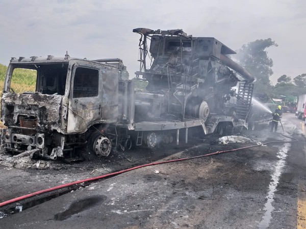 Liberada a rodovia após incêndio em caminhão que transportava colheitadeira