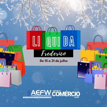 A tradicional campanha de liquidação do comércio de Frederico Westphalen chegou em sua edição de inverno. De 15 a 31 de julho, clientes de toda a região poderão aproveitar descontos especiais e ofertas exclusivas durante o Liquida Frederico, campanha realizada pelo Núcleo de Desenvolvimento do Comércio da Associação Empresarial ACI/CDL (AEFW).