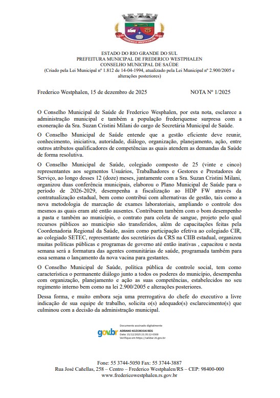 Com a exoneração, o Conselho Municipal de Saúde de Frederico Wesphalen, emitiu uma nota que igualmente foi entregue a gestão municipal solicitando esclarecimentos sobre a decisão, uma vez que, de acordo com o documento Suzan estaria cumprindo com as obrigações inerentes a função - como a elaboração do Plano Municipal de Saúde para o período de 2026-2029 e até mesmo inovações como a etodologia de marcação de exames laboratoriais, ampliando o controle dos mesmos, pontuou o presidente do Conselho Adriano Reis.