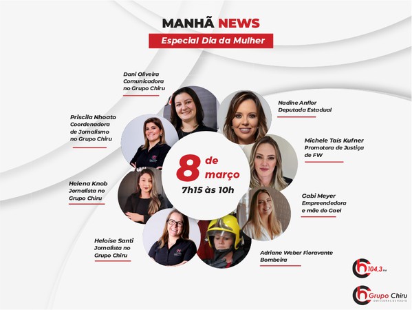 Para celebrar o Dia Internacional da Mulher, o Grupo Chiru Emissoras de Rádio preparou uma programação especial. O programa Manhã News da 104,3 FM – A sua rádio news! será apresentado por mulheres e terá somente mulheres como entrevistadas.
