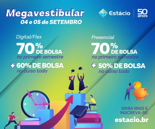 Estão abertas as inscrições para o Megavestibular da Estácio, nos dias 4 e 5 de setembro. Os descontoschegam a 70% no primeiro semestre e 60% no valor das mensalidades durante toda a graduação, no modo digital/ flex.