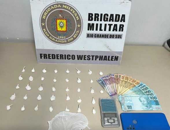 Durante a ação da Brigada Militar (BM), foi apreendido com ele, 36 buchas de substância com características de cocaína e uma quantia em dinheiro/espécie.