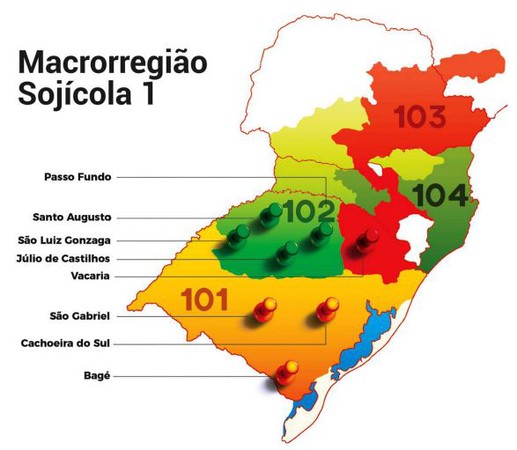 Já as regiões analisadas, foram separadas em oito locais dentro das três microrregiões sojícolas do estado (101, 102 e 103), também conforme o Zoneamento Agrícola do Mapa.