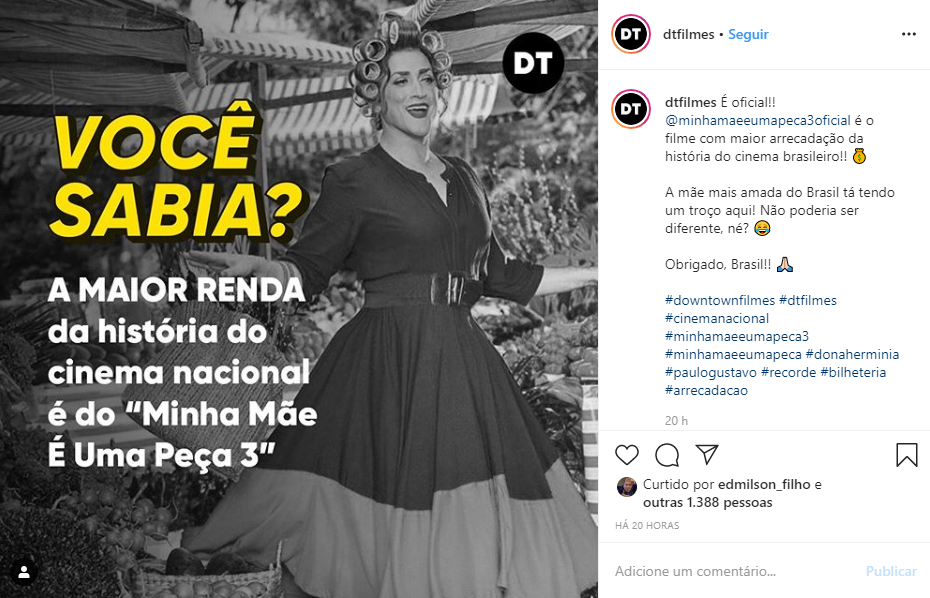 O filme nacional "Minha mãe é uma peça 3", que estreiou nos cinemas no dia 26 de dezembro de 2019, é a produção com maior arrecadação do cinema brasileiro, a distribuidora Downtown Filmes responsável pela distribuição da obra de Paulo Gustavo, anunciou no Instagram, o filme arrecadou R$ 138 milhões em menos de um mês de exibição.