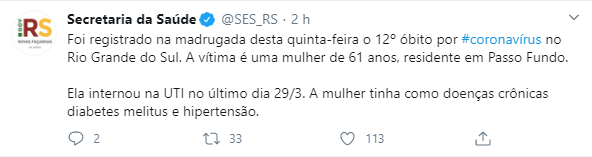 A Secretaria de Saúde do RS confirmou a 12º morte por Covid-19 no Estado, a vítima é uma mulher de 61 anos, residente em Passo Fundo. Ela internou na UTI no último dia 29 de março, a mulher tinha doenças crônicas de diabetes e hipertensão.