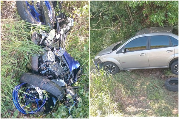 Acidente envolveu uma motocicleta e um automóvel na tarde desta terça-feira; passageira do veículo ficou ferida gravemente