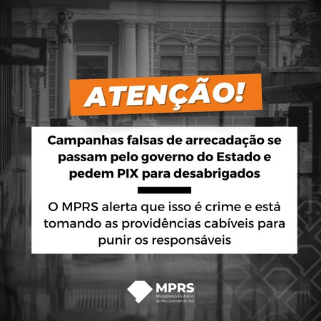 A promotora Maristela Schneider destaca que o Rio Grande do Sul passa pela maior tragédia climática de sua história, com mortos, desaparecidos e milhares de desabrigados, além de danos em vários municípios. Segundo a promotora, são perfis fakes que usam a mesma identidade visual das páginas e perfis do governo gaúcho, mas com PIX direcionados a contas particulares.