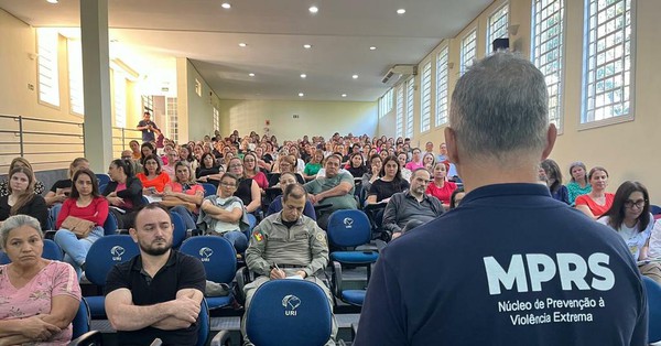 O Ministério Público do Rio Grande do Sul (MPRS), por meio do Núcleo de Prevenção à Violência Extrema, apresentou nesta quarta-feira, 16 de abril, o Projeto Sinais a representantes da comunidade escolar, conselheiros tutelares, integrantes da rede de proteção dos sete municípios da Comarca de Frederico Westphalen - Frederico Westphalen, Caiçara, Vicente Dutra, Vista Alegre, Palmitinho, Taquaruçu do Sul e Pinheirinho do Vale - e a integrantes do 37° Batalhão de Polícia Militar (BPM).