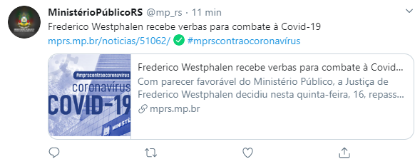 Conforme o promotor Denis Gitrone, este é o segundo parecer favorável do MP sobre este tipo de repasse para auxílio no combate ao novo coronavírus. No final do mês de março, também com valores provenientes do fundo, cerca de R$ 220 mil foi destinado ao Hospital Divina Providência, de Frederico Westphalen. Na ocasião, foram adquiridos uma central de vácuo, oito aspiradores cirúrgicos e uma máquina de hemodiálise.