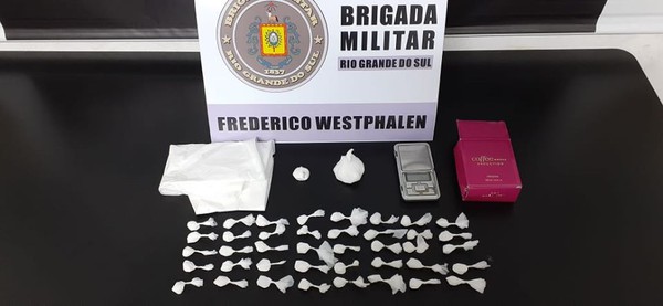 A guarnição da Brigada Militar efetuou a abordagem e apreendeu 67 gramas de cocaína, sendo parte da droga fracionada em 40 buchas, uma balança de precisão, material para embalagem e celulares