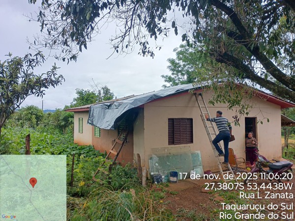 Em Três Passos, uma residência foi destelhada na VRS-822, próximo ao pórtico de Esperança do Sul. A Defesa Civil entregou lonas aos moradores para cobertura emergencial.