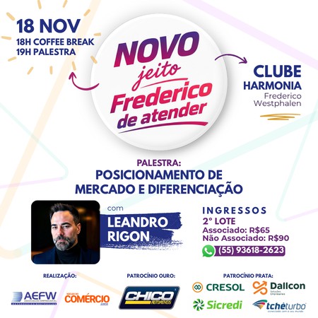 A Associação Empresarial ACI/CDL de Frederico Westphalen (AEFW) e o Núcleo de Desenvolvimento do Comércio realizam, na próxima segunda-feira, 18 de novembro, o evento “Novo Jeito Frederico de Atender”, no Clube Harmonia. A programação inicia às 18 horas com coffee break, seguida da palestra às 19 horas, ministrada por Leandro Rigon.