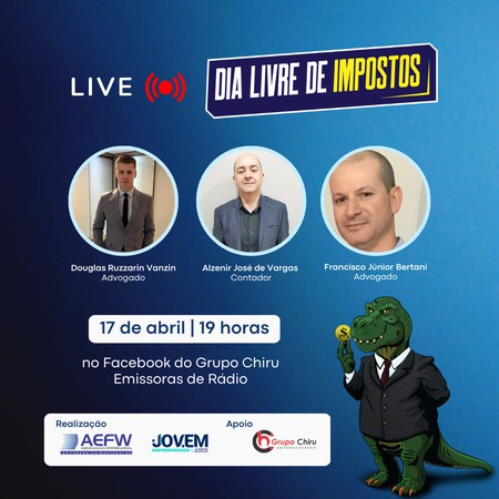 Na próxima segunda-feira, 17 de abril, a Associação Empresarial ACI/CDL e o Núcleo do Jovem Empreendedor, com apoio do Grupo Chiru Emissoras de Rádio, realizam uma live com o intuito de trazer mais informações sobre o Dia Livre de Impostos (DLI) e promover um bate papo com os advogados Douglas Ruzzarin Vanzin e Francisco Junior Bertani, e o contador Alzenir José de Vargas.