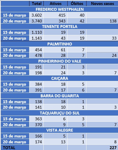 Os municípios que apresentaram aumento no número de casos ativos foram Tenente Portela (19 para 43), Pinheirinho do Vale (21 para 24), Taquaruçu do Sul (6 para 9) e Vista Alegre (5 para 13).