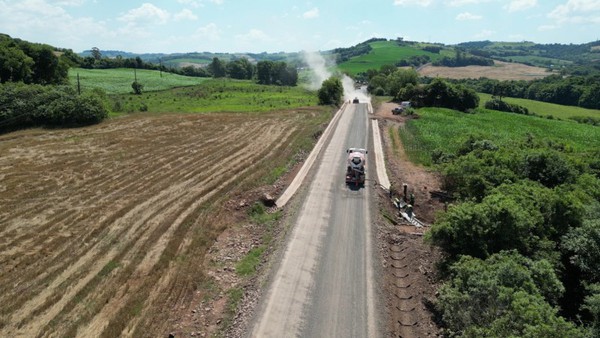 O asfalto no acesso municipal a Novo Tiradentes está tomando forma. Dos 7,8 quilômetros que ligam a cidade até a ERS-323, em Pinhal, três já tiveram a pavimentação concluída.