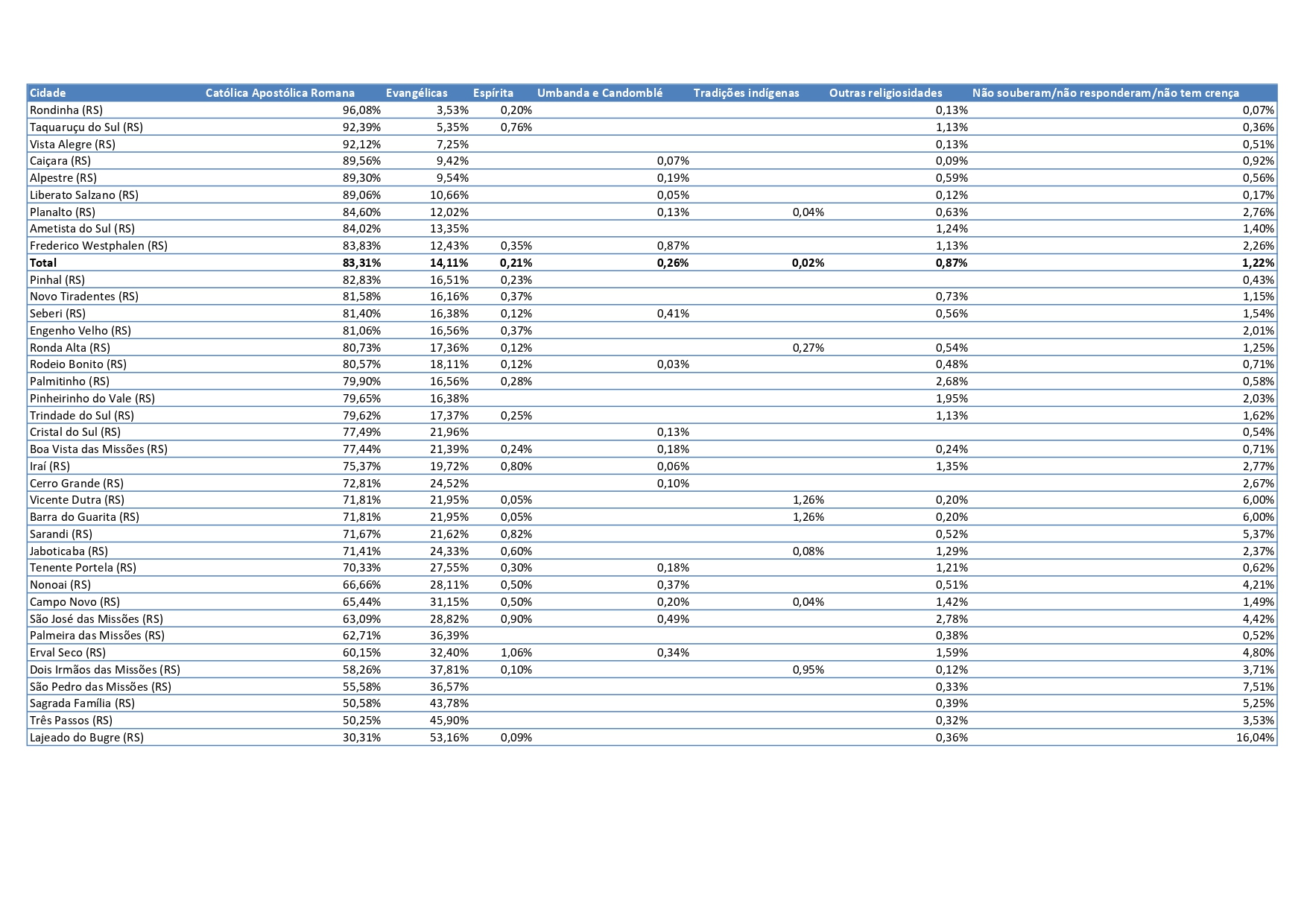 O Censo demonstra, ainda, que em 20 cidades brasileiras o número de católicos ultrapassa 95% da população. Destas, 14 ficam localizadas no Rio Grande do Sul.