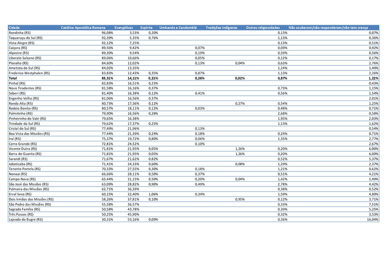 O Censo demonstra, ainda, que em 20 cidades brasileiras o número de católicos ultrapassa 95% da população. Destas, 14 ficam localizadas no Rio Grande do Sul.