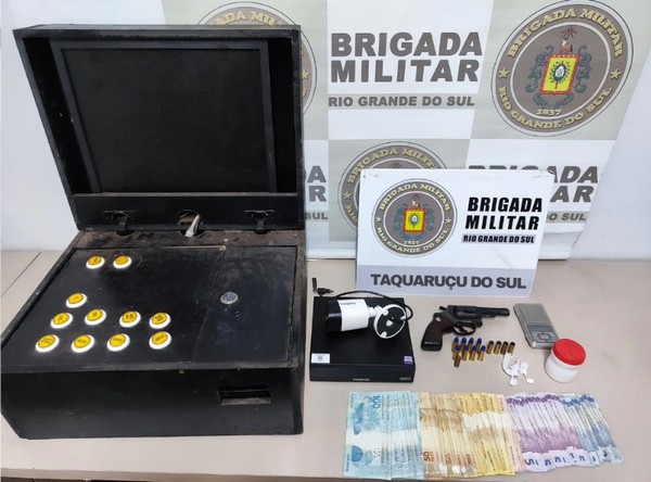 Na noite desta sexta-feira, 17 de maio, policiais militares do 37º Batalhão de Polícia Militar prederam um homem de 49 anos de idade por porte ilegal de arma, jogos de azar e tráfico de drogas no município de Taquaruçu do Sul.
