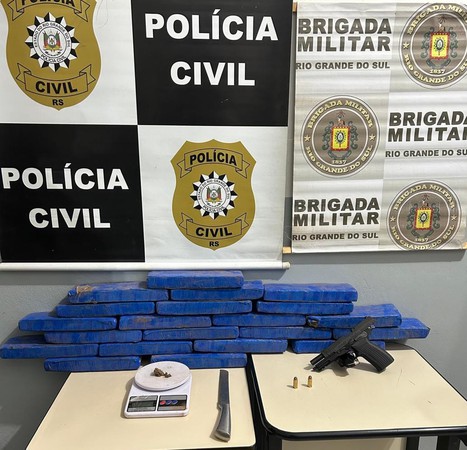 Os policiais localizaram vinte e um tijolos da droga, além de uma pistola calibre nove milímetros e uma balança de precisão. O material estava escondido sob a residência, o que indica tentativa de ocultação.