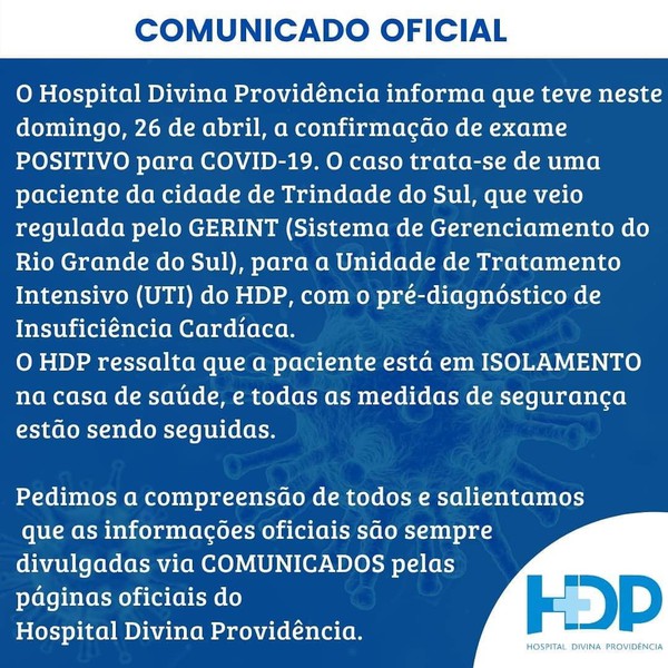 Uma paciente de 70 anos de Trindade do Sul, internado na Unidade de Terapia Intensiva (UTI) do Hospital Divina Providência (HDP), de Frederico Westphalen, testou positivo para Covid-19. O resultado do exame foi divulgado na manhã deste domingo, 26.