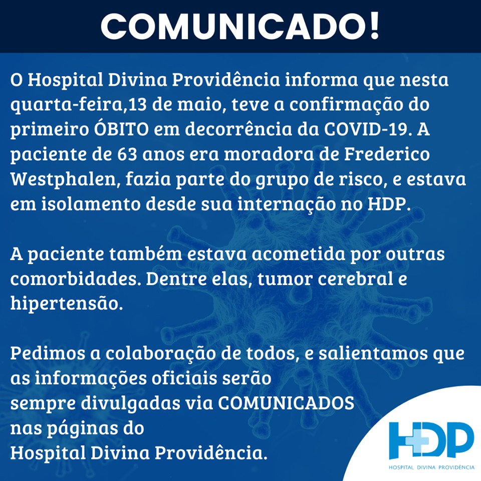 Em comunicado oficial o Hospital Divina Providência (HDP) de Frederico Westphalen informa que nesta quarta-feira,13 de maio, teve a confirmação do primeiro óbito em decorrência da COVID-19. A paciente de 63 anos era moradora de Frederico Westphalen, fazia parte do grupo de risco, e estava em isolamento desde sua internação na casa de saúde, no dia 8 de maio.