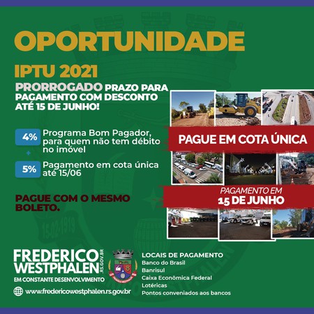 Os contribuintes de Frederico Westphalen poderão quitar o Imposto Predial e Territorial Urbano (IPTU) 2021 até 15 de junho com o mesmo boleto. O prazo de pagamento foi prorrogado através do Decreto 37/2021.