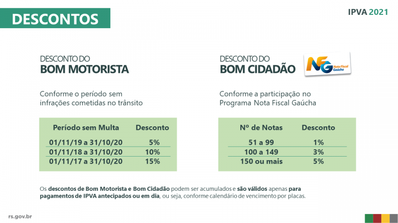 Também em três faixas, a redução no valor do IPVA pelo Bom Cidadão resulta da participação do contribuinte (pessoa física) no programa da Nota Fiscal Gaúcha (NFG) e a solicitação de notas com CPF na hora da compra. O desconto máximo de 5% será para quem tiver 150 notas ou mais, de 3% para quem tiver entre 100 a 149 notas e de 1% para o contribuinte entre 51 a 99 documentos fiscais devidamente registrados. Ao todo, 15,3% da frota tributável terá direito ao benefício.