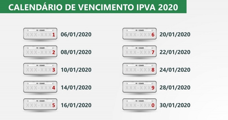 Entre as alterações anunciadas para o IPVA 2020, pelo governo do Rio Grande do Sul, em coletiva na manhã desta segunda-feira, 4, estão a antecipação do calendário do tributo de abril para janeiro. Ao longo deste mês, os vencimentos ocorrerão de 06/01/20 a 30/01/20.