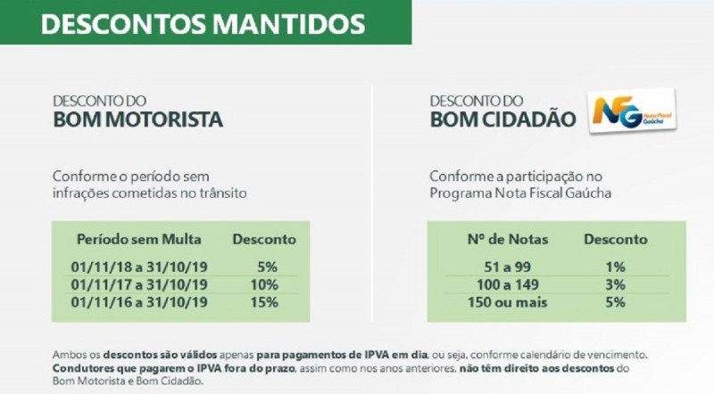Ambos os descontos são válidos apenas para pagamentos de IPVA em dia, ou seja, conforme calendário de vencimento por placas, e podem ser acumulados. Condutores que pagarem o tributo fora do prazo, assim como nos anos anteriores, não têm direito aos descontos do Bom Motorista e Bom Cidadão.
