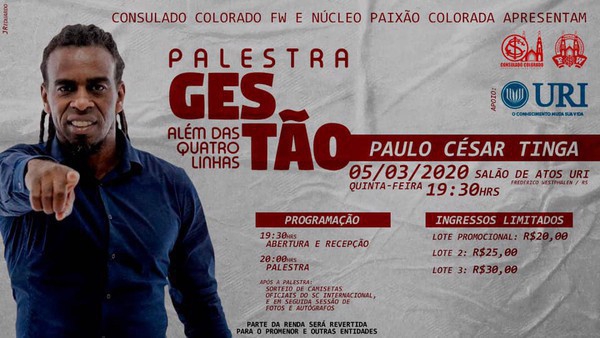 A palestra com o personagem do futebol, Paulo César Tinga, trará ao palco do Salão de Atos da URI-FW, nesta quinta-feira, às 19h30, o tema “Gestão, além das quatro linhas”. O evento é organizado pelo Núcleo Paixão Colorada/Consulado de Frederico Westphalen.