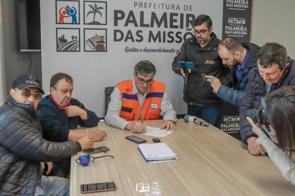 O prefeito em exercício de Palmeira das Missões, Régis Lorenzoni, assinou nesta quarta-feira, 6 de setembro, com a presença de secretários, defesa civil, Câmara de Vereadores, Defesa Civil e imprensa, o decreto que declara situação de emergência em Palmeira das Missões em decorrência das chuvas dos últimos dias.