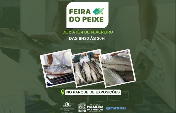 Começa nesta quinta-feira, 2 de fevereiro, a primeira edição 2023 da Feira do Peixe Vivo de Palmeira das Missões, no Parque de Exposições. Até o dia 4 de fevereiro, serão comercializados peixes vivos direto do produtor, das 8h30 às 20h.