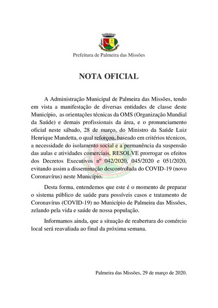 Em nota divulgada na manhã deste domingo, 29, a administração do município de Palmeira das Missões comunica a população da manutenção dos decretos que restringem a circulação, a suspensão das atividades escolares e do comércio.