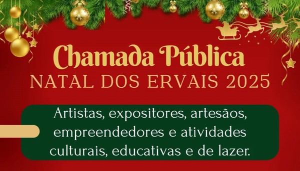 A Secretaria de Cultura e Turismo abriu inscrições para artistas, expositores, artesãos, empreendedores e propostas de atividades culturais, educativas e de lazer interessados em integrar a programação do Natal dos Ervais 2025. As inscrições seguem até 1º de dezembro.