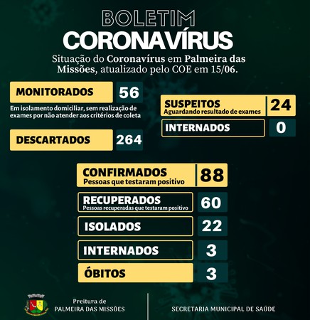 Nesta segunda-feira, 15 de junho, o município apresenta o total de 88 casos confirmados, sendo 60 destes recuperados, 25 casos seguem como vírus ativo, três deles estão internados os demais em isolamento domiciliar. O município já soma três óbitos pela doença.