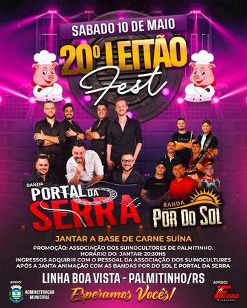 Promovido pela Associação dos Suinocultores de Palmitinho (ASPAL) a 20ª LeitãoFest acontecerá no sábado, 10 de maio. A tradicional festa que promove a suinocultura do município é realizada na Linha Boa Vista com parceria da prefeitura, câmara de vereadores e secretaria da agricultura. O presidente da Aspal, Luciano Dallasta, o vice-presidente João Gabriel Bonafé Barth e o tesoureiro Jarcelino da Silva estiveram na Rádio Chiru divulgando a programação do evento.