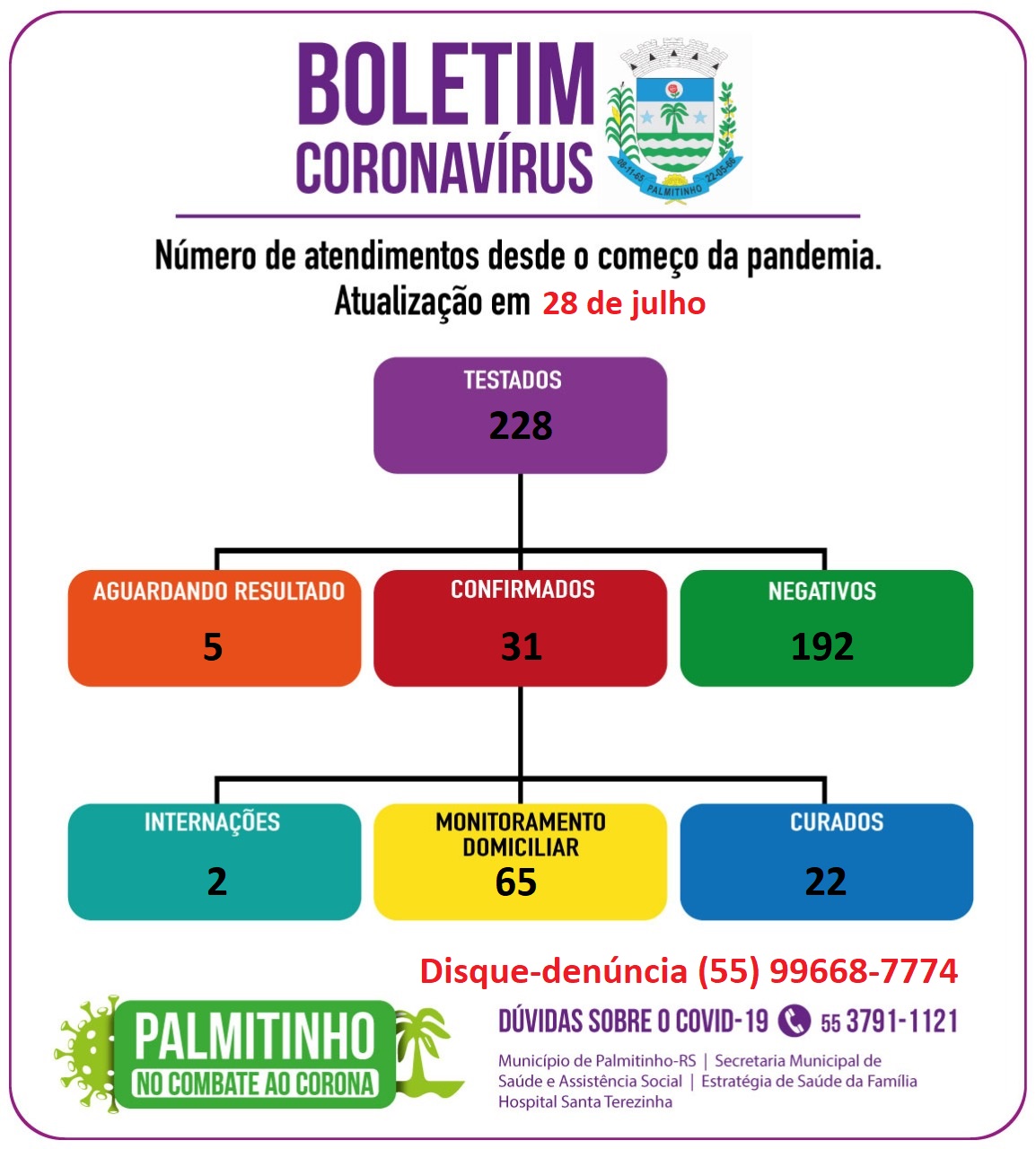 Conforme o Boletim Epidemiológico da Secretaria de Saúde divulgado nesta quarta-feira, 29 de julho, já foram testadas no município 228 pessoas com sintomas de Covid-19. Do total, 192 testaram negativo e 31 positivo. Cinco amostras ainda aguardam resultado de exame. Entre os diagnosticados com a doença, 22 já são considerados curados.