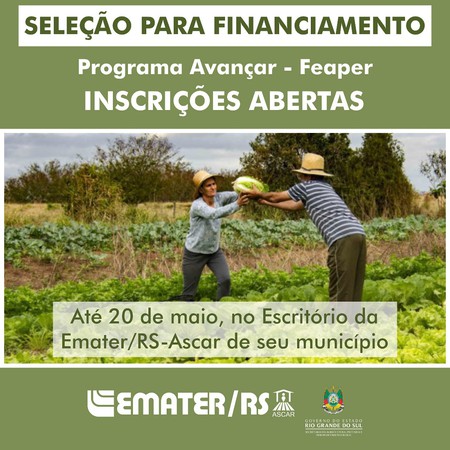 Estão abertas até o próximo dia 20 de maio, as inscrições para o Programa Avançar - FEAPER em Palmitinho. Estão aptos para a inscrição os agricultores e pecuaristas familiares que pretendem obter financiamento por meio do Fundo Estadual de Apoio ao Desenvolvimento dos Pequenos Estabelecimentos Rurais (Feaper).
