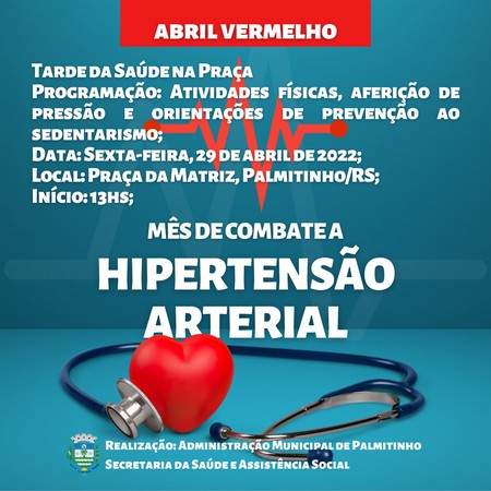 A Administração Municipal através da Secretaria da Saúde e Assistência Social de Palmitinho promove a “Tarde da Saúde na Praça”, na próxima sexta-feira (29), na Praça da Matriz. O evento é alusivo ao Abril Vermelho, mês de combate a hipertensão arterial e a doenças relacionadas, comemorado em todo o país.