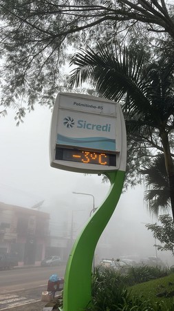 Palmitinho registrou temperatura negativa na manhã desta sexta-feira, 12 de julho. O termômetro da Praça da Matriz marcou -3ºC, por volta das 8h20. O equipamento registra a sensação térmica.