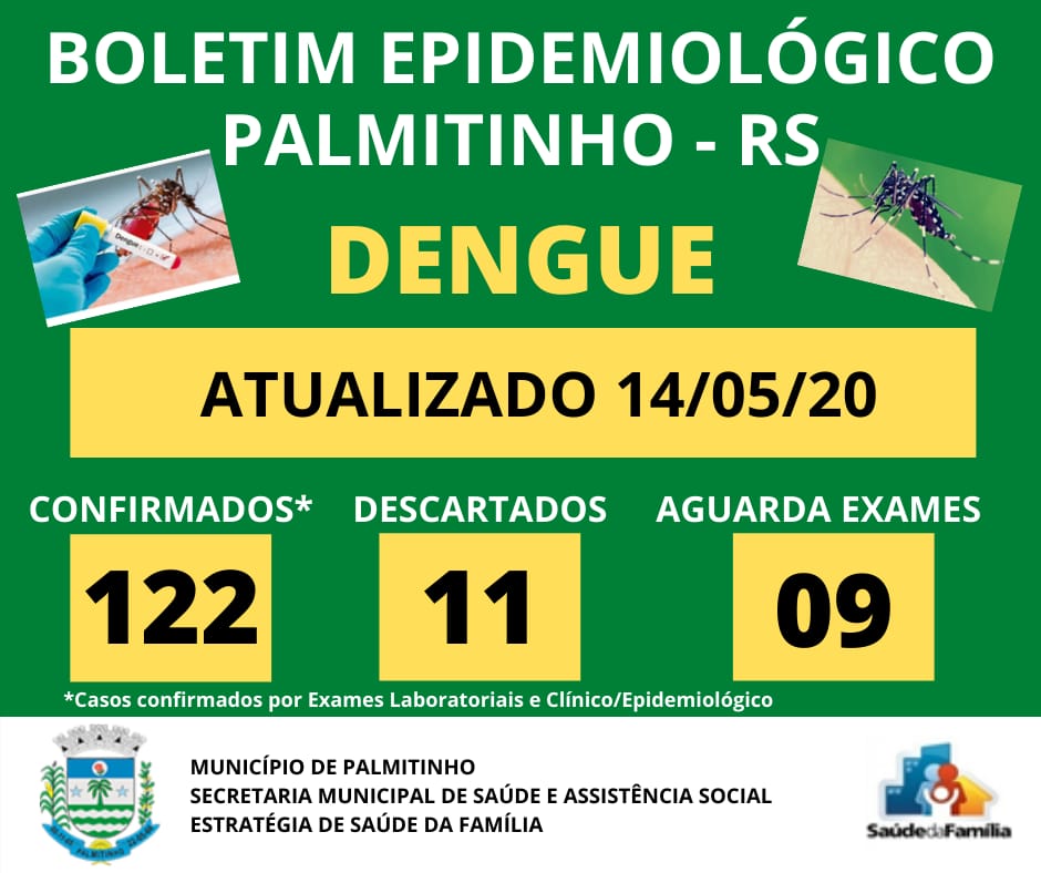 Boletim Epidemiológico divulgado pela Secretaria de Saúde de Palmitinho nesta quinta-feira, 14 de maio, aponta 122 casos confirmados de dengue no município.
