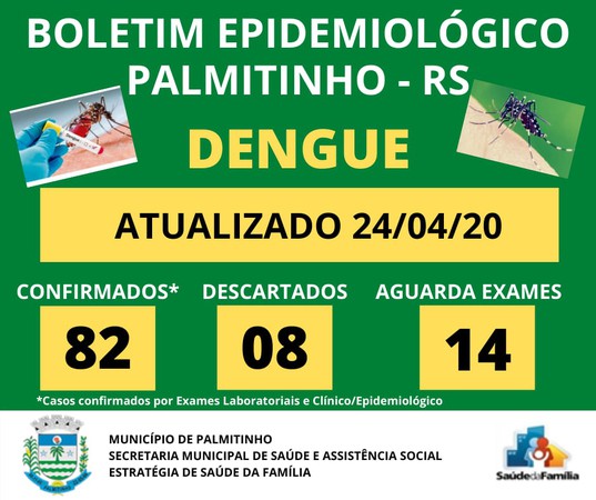 Segundo o último boletim epidemiológico de Secretaria de Saúde de Palmitinho o município tem 82 casos confirmados de dengue.