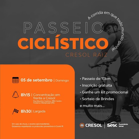 A largada acontecerá no domingo, 5, em frente à sede da Cresol Raiz em Frederico Westphalen, às 8h30. Para o passeio serão instalados pontos com distribuição de água, disponibilizada uma ambulância e respeitados os protocolos de prevenção à covid-19.