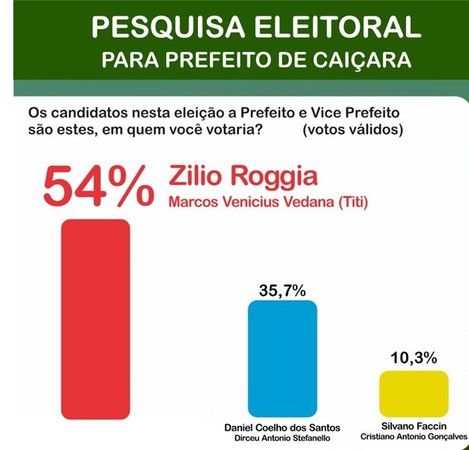 A pesquisa indica Zílio Roggia (MDB) e Marcos Vínicius Vedana (MDB) com 44,6% dos votos na pergunta estimulada. Na segunda posição aparecem os candidatos da Coligação Caiçara para Todos (PDT/PP e PT), Daniel Coelho dos Santos (PDT) e Dirceu Stefanello (PDT), com 29,5%. Já Silvano Faccin (PSDB) e Cristiano Gonçalves (PSD) tem 8,5% das intenções de voto, segundo o levantamento.