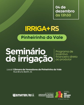 A Administração de Pinheirinho do Vale, em parceria com a Secretaria Estadual da Agricultura, Pecuária, Produção Sustentável e Irrigação, Emater/RS-Ascar e entidades apoiadoras, promove na próxima quinta-feira, 4 de dezembro, o Seminário de Irrigação do Programa IRRIGA+RS.