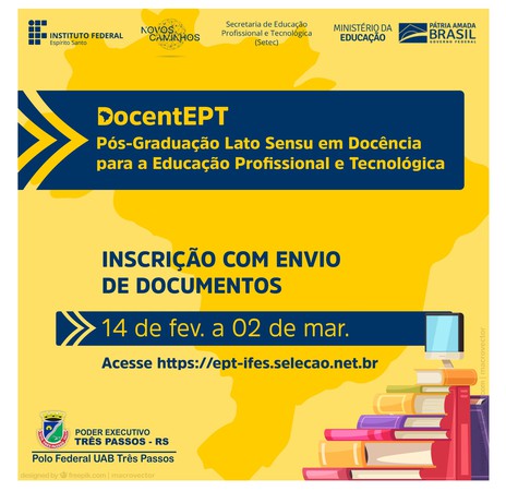 Para o Polo Federal UAB de Três Passos serão ofertadas 50 vagas. A promoção do curso está sendo realizada pelo Instituto Federal do Espírito Santo (IFES) em parceria com o Instituto Federal de Santa Catarina (IFSC).