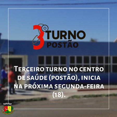 A Secretaria Municipal de Saúde informa que a partir da próxima segunda-feira, dia 18, entrará em funcionamento o terceiro turno de atendimentos da atenção básica à saúde. O plantão será no Centro de Saúde (Postão), das 18h às 22h, de segunda à sexta-feira. Uma equipe com médico, enfermeiro, técnico de enfermagem e atendente estará à disposição para consultas de clínica geral, para todo o público.