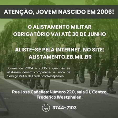 A Junta de Serviço Militar de Frederico Westphalen também informa que os jovens nascidos em 2004 e 2005 e que não se alistaram no ano devido deverão comparecer presencialmente na sede do órgão para regularizar a situação o mais rápido possível.